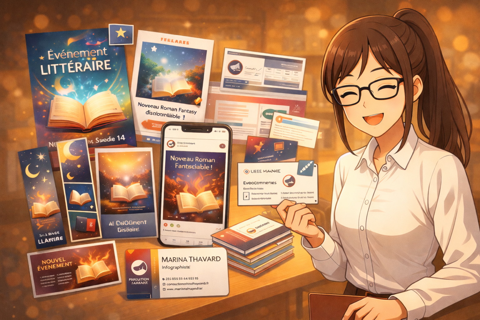 En tant qu’infographiste freelance, j’accompagne les auteurs, entrepreneurs et créateurs dans la création de visuels professionnels : logos, couvertures, supports de communication et identité visuell